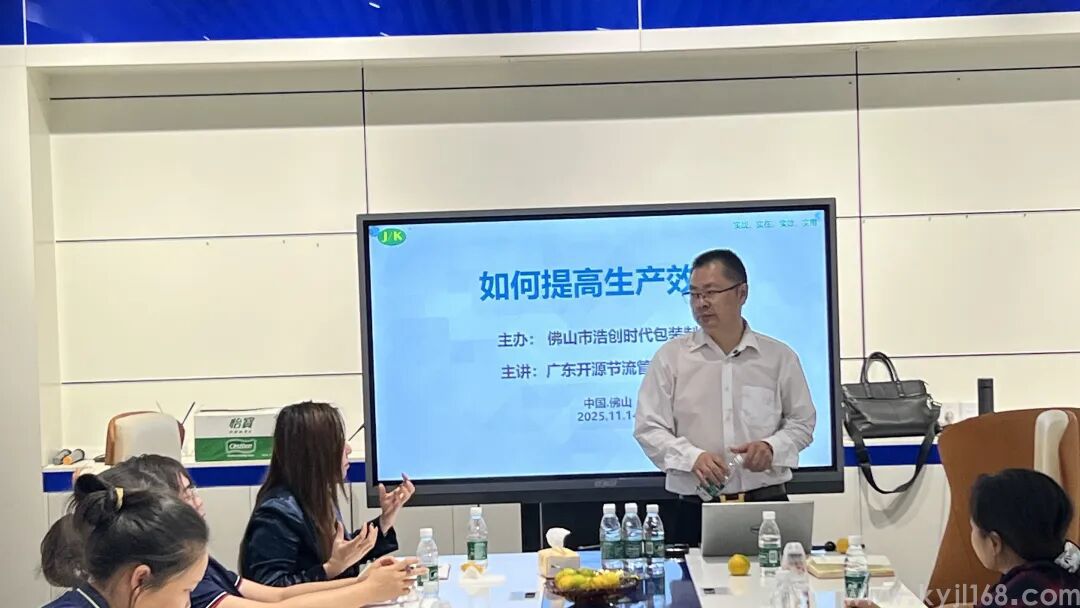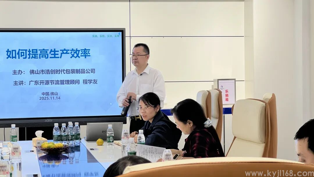 2025年11月14日,开源节流程总受邀到佛山市浩创时代包装制品有限公司主讲《如何提高生产效率》。提高生产效率的工具:1.建立5S管理体系2.消除或降低八大浪费